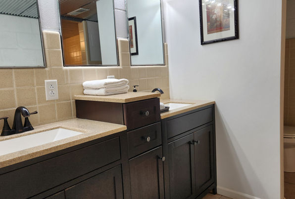 The Garden Level includes private access as well as 2 bathrooms, kitchen with a bar, living room and dining room. Decorated with eclectic pieces from all around the world, it is perfect for teams, extended stays, and large families.